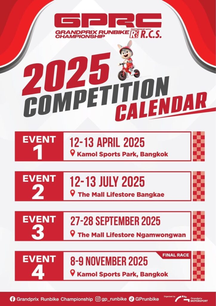 “การแข่งขันรายการที่จัดขึ้นนี้ ไม่ได้เป็นเพียงแค่สนามประลองความเร็วสำหรับเด็กๆ แต่ยังเป็นเวทีที่สะท้อนถึงความสำคัญของการสร้างรากฐานกีฬาเยาวชน รวมถึงการพัฒนาทักษะในด้านต่างๆ ที่ไม่ใช่เพียงแค่ร่างกาย เราหวังว่าซีรีส์การแข่งขันนี้ จะสามารถสร้างแรงบันดาลใจใหม่ให้กับวงการกีฬาและครอบครัวทั่วโลก โดยประเทศไทยพร้อมเปิดบ้านต้อนรับนักกีฬาและผู้ชมจากทุกมุมโลกสู่สนามแข่งขันที่เปี่ยมไปด้วยพลังและความสนุกสนาน ติดตามรายละเอียดเพิ่มเติมได้ที่เพจ Grandprix Runbike Championship และช่องทางโซเชียลมีเดียในเครือกรังด์ปรีซ์ฯ”