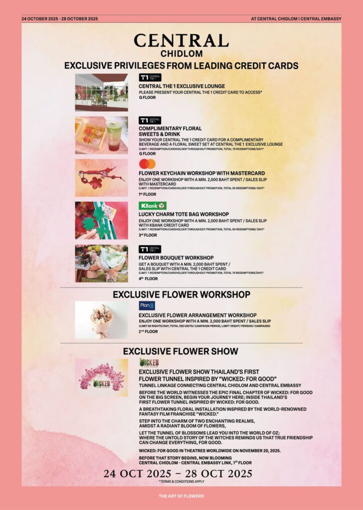 - ครั้งแรกของประเทศไทย! กับ “THE FLOWER TUNNEL INSPIRED BY WICKED FOR GOOD” พบกับอุโมงค์ดอกไม้สุดตระการตาที่ได้รับแรงบันดาลใจจากภาพยนตร์แฟนตาซีชื่อดังระดับโลก “WICKED” พร้อมให้คุณสัมผัสเสน่ห์ของสองมนตรา ผ่านหมู่มวลดอกไม้ที่เปล่งประกายงดงาม ที่บริเวณทางเชื่อมชั้น 1 ห้างเซ็นทรัลชิดลมและเซ็นทรัลเอมบาสซีและเตรียมพบกับ Wicked: For Good Experience ที่ ชั้น G ห้างเซ็นทรัลชิดลม ในวันที่ 11 – 30 พ.ย. 68