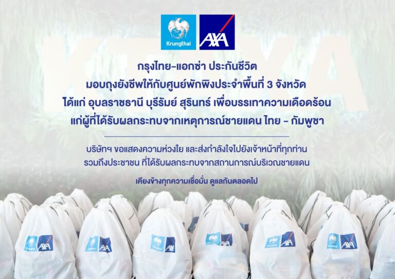 BANKING & INSURANCEกรุงไทย-แอกซ่าประกันชีวิต เคียงข้างคนไทยมอบถุงยังชีพ 300 ชุดให้แก่ศูนย์พักพิงประจำพื้นที่ 3 จังหวัดเพื่อช่วยบรรเทาทุกข์ประชาชนจากสถานการณ์ชายแดนไทย-กัมพูชา