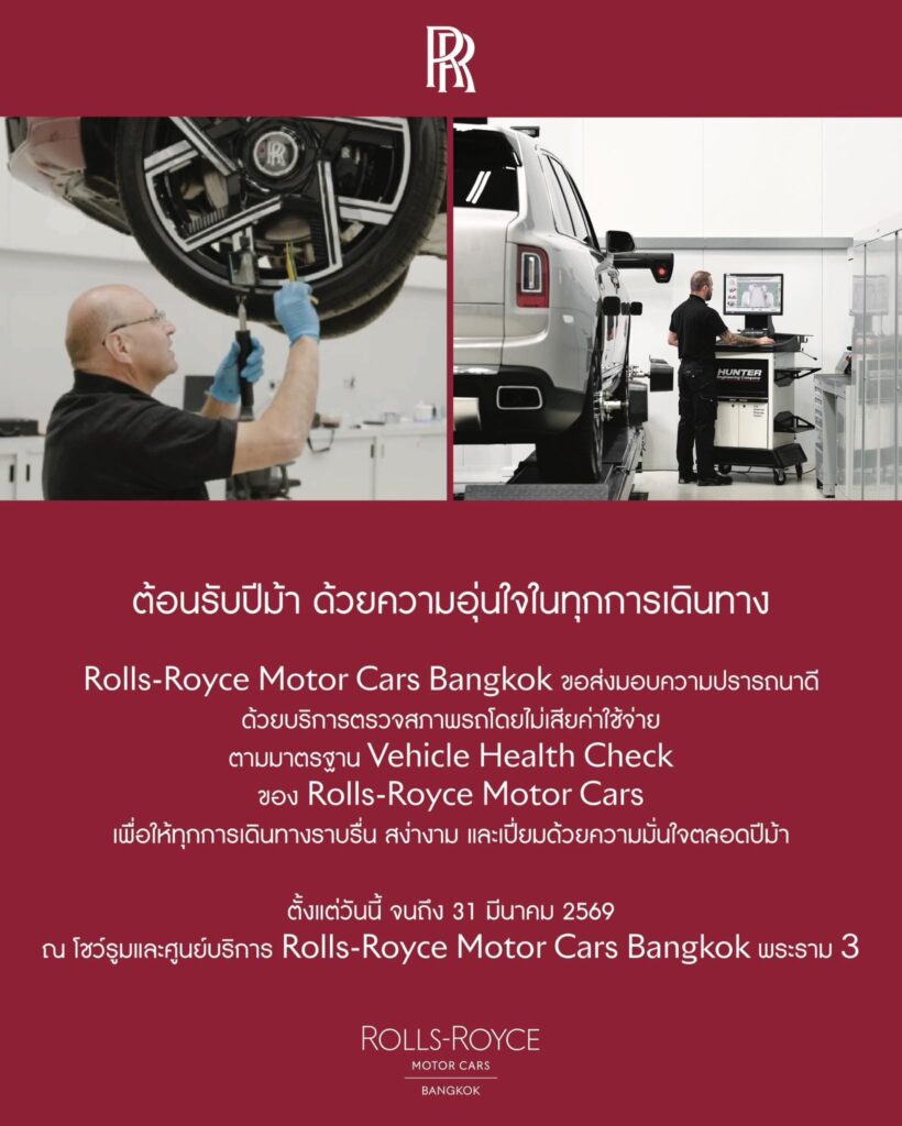 นอกจากนี้ โรลส์-รอยซ์ มอเตอร์ คาร์ส แบงคอกขอส่งมอบความอุ่นใจ ห่วงใยในทุกการเดินทาง ด้วยบริการตรวจสภาพรถตามมาตรฐาน Vehicle Health Check ของ โรลส์-รอยซ์ มอเตอร์ คาร์ส โดยไม่คิดค่าใช้จ่าย เพื่อให้ทุกเส้นทางของท่านราบรื่น สง่างาม เปี่ยมด้วยความมั่นใจ พร้อมขอเชิญลูกค้าที่นำรถเข้ามารับบริการ สมัครเป็นสมาชิก Whispers เพื่อรับสิทธิประโยชน์หลากหลาย รวมถึงประสบการณ์ที่หรูหราเหนือระดับ ตั้งแต่วันนี้ถึง 31 มีนาคม 2569 ที่โชว์รูมและศูนย์บริการ โรลส์-รอยซ์ มอเตอร์ คาร์ส แบงคอกพระราม 3